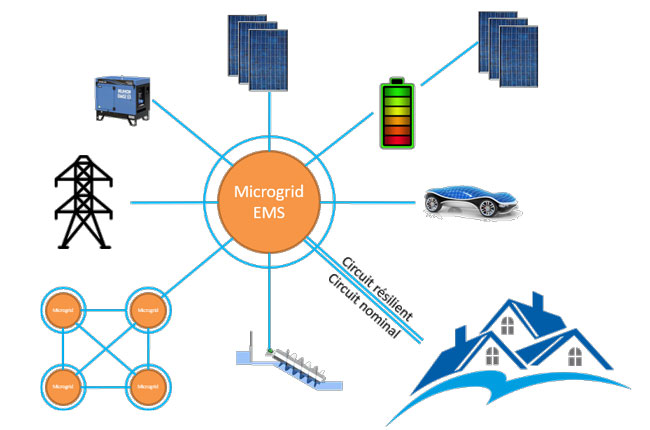 Un Microgrid est une architecture intelligente qui pilote un groupe de consommateurs, et de producteurs électriques travaillant en complément du réseau pour optimiser les coûts énergétiques. Le Microgrid peut prendre la décision de se déconnecter du réseau (mode ilotage) pour fonctionner de manière autonome, puis se reconnecter lorsque le besoin d'en fait sentir.